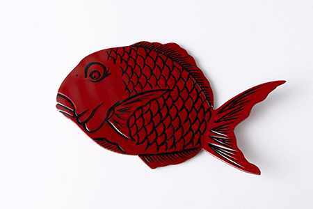 高岡漆器の伝統の鯛彫りを今風にアレンジした鯛トレー。立体感を出すように木地を作成し持ちやすいようにも工夫してあるおしゃれな鯛。